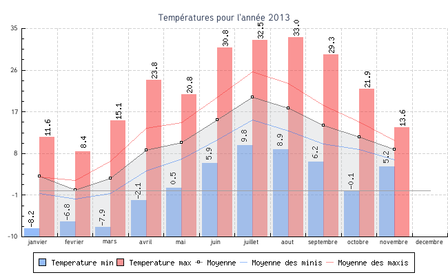 | fevrier | -6.8 °C | -1.9 °C | 8.4 °C | 2.2 °C | 0.1 °C | 8.7 km/h | 66.0 km/h | NNE |
