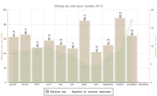| novembre | 5.2 °C | 6.6 °C | 13.6 °C | 10.8 °C | 8.8 °C | 17.9 km/h | 64.4 km/h | SSO |