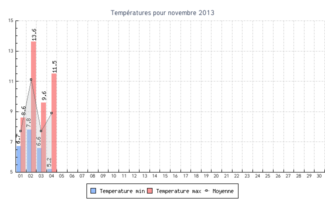 | 04 | 5.2 °C | 11.5 °C | 8.9 °C | 23.7 km/h (64.4 km/h) | SO |